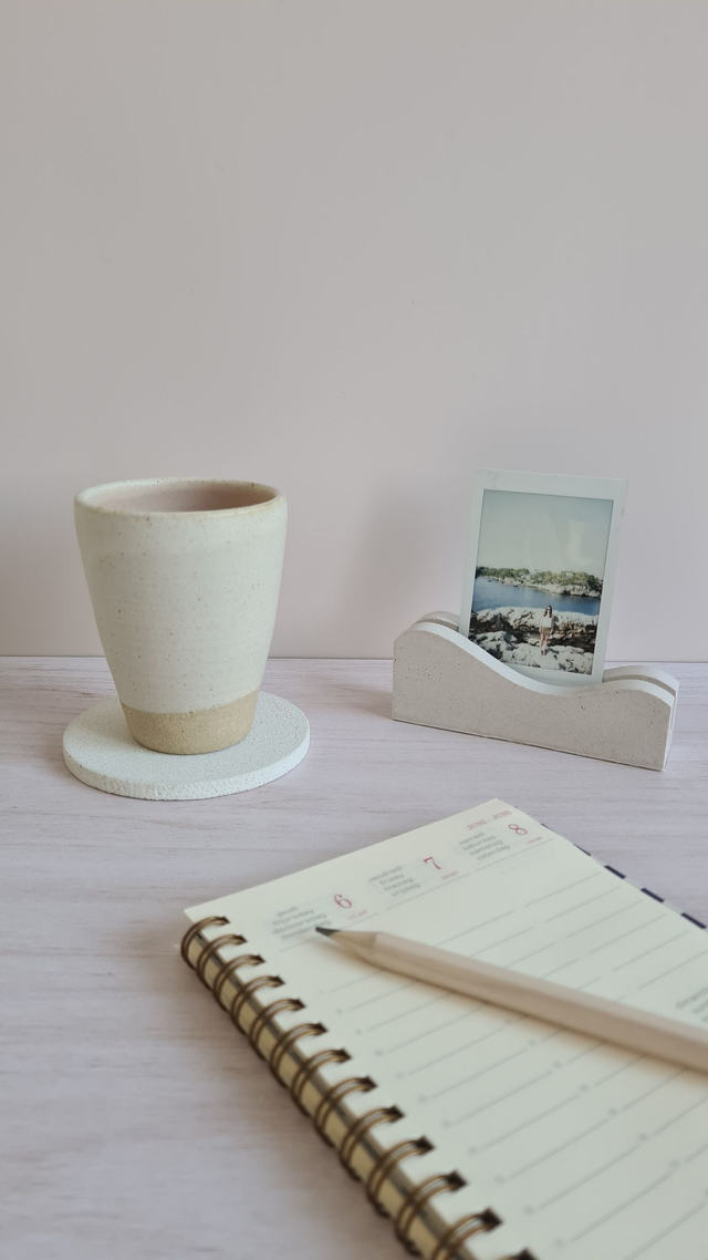Un petit socle artisanal en jesmonite, pensé pour accueillir tes cartes de visite, une citation inspirante ou une photo qui t’accompagne au quotidien.